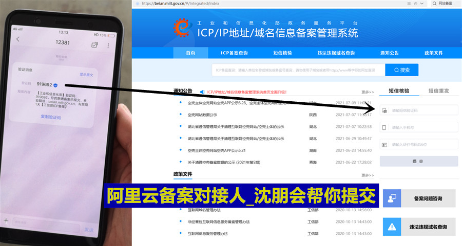 在接到备案电话核实后,1个工作日内手机会收到工信部发送的一个备案验证码,发阿里云备案对接人_沈朋就行了
